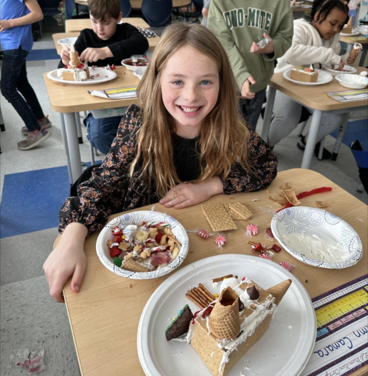 Mrs. Bean's third grade class made creative use of candy, chocolate, icing and graham crackers and turned them into Gingerbread Houses. |
