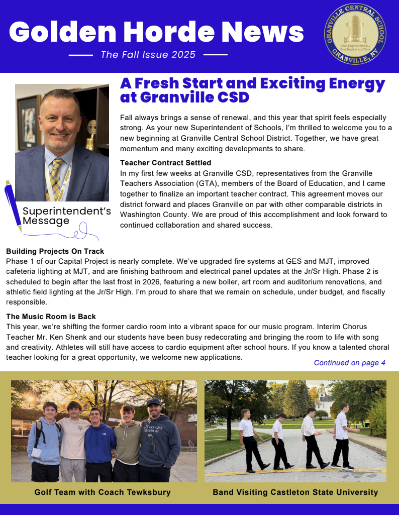 Welcome to the first Granville CSD Community newsletter! In this issue you'll find updates from our schools for those living in the Granville region and beyond.