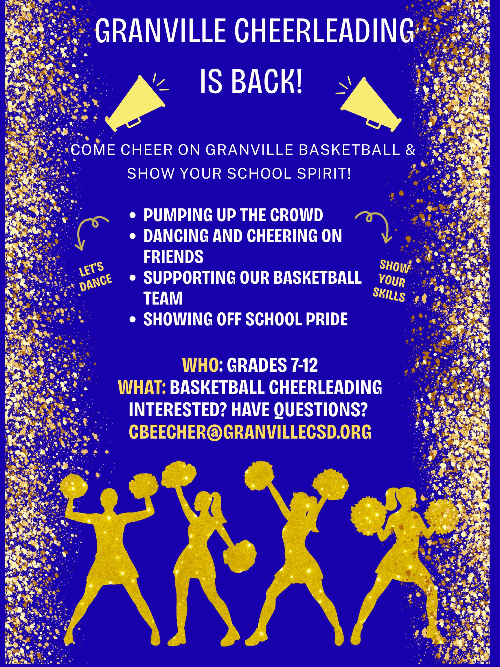 It's not too late to join Cheer! Contact GES Nurse Courtney Beecher and Cheer Club Advisor for questions or to join cheer for basketball games. cbeecher@granvillecsd.org