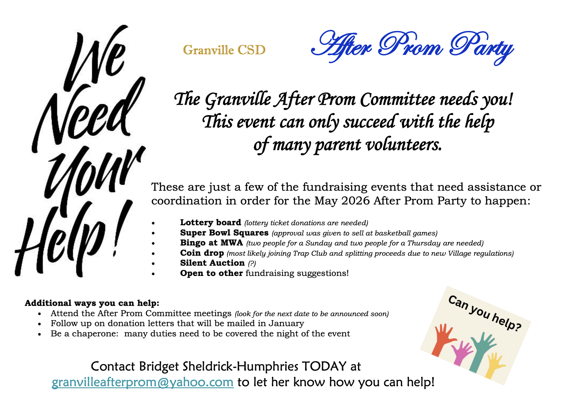 Please contact Bridget Sheldrick-Humphries TODAY at granvilleafterprom@yahoo.com for questions and how you would like to get involved.