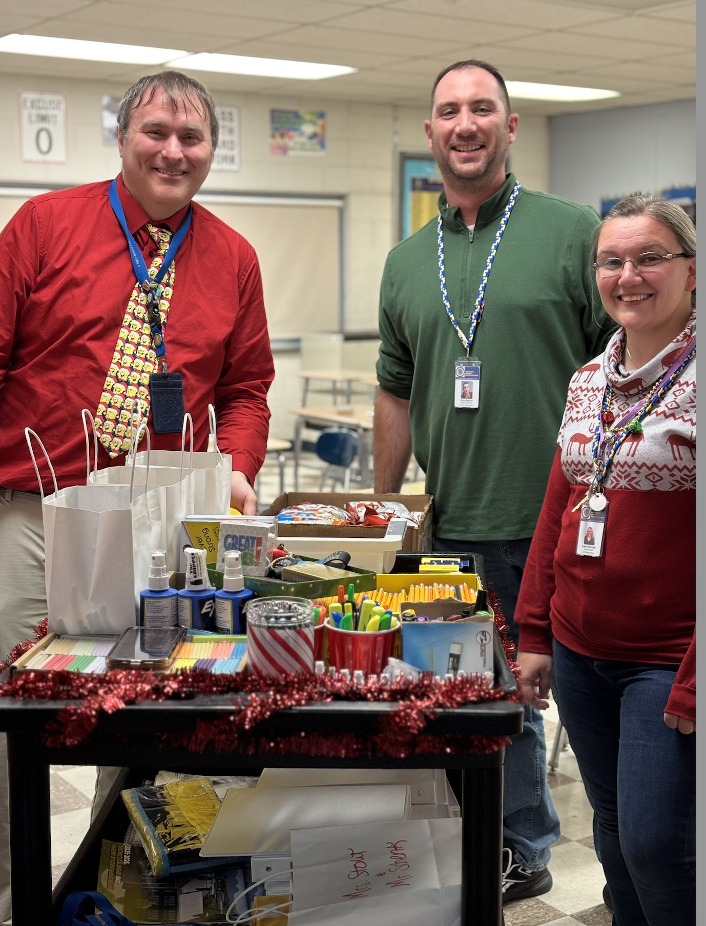 Dean of Students, Mr. Burton and Principal Nassivera along with Secretaries Mrs. Nichols and Mrs. Vogel surprised teachers today with holiday tunes and carts filled with free school supplies. The most popular? Pencils!