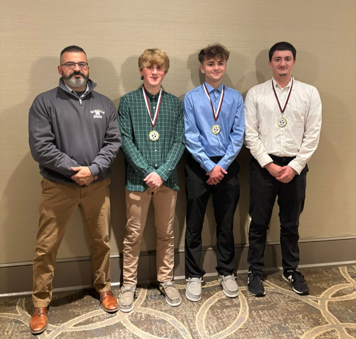 Pictured L-R - Head Coach Stowhas, Matthew Ruigrok, Camden Woodruff, and Ft. Ann Player Marcus Stowhas (Picture by Parent, Deb Ruigrok)