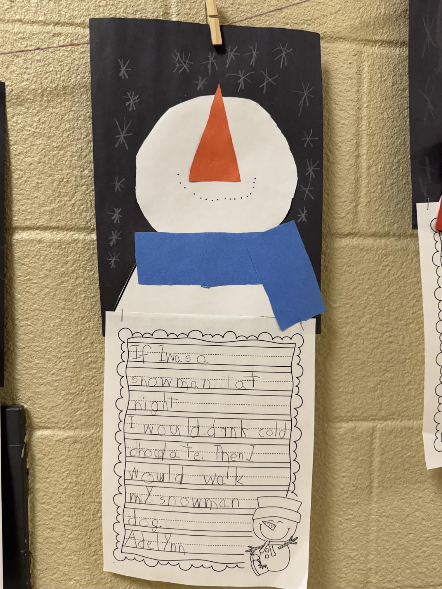This student's snowman reads "If I was a snowman, at night I would drink cold chocolate. Then I would walk my snowman dog." |