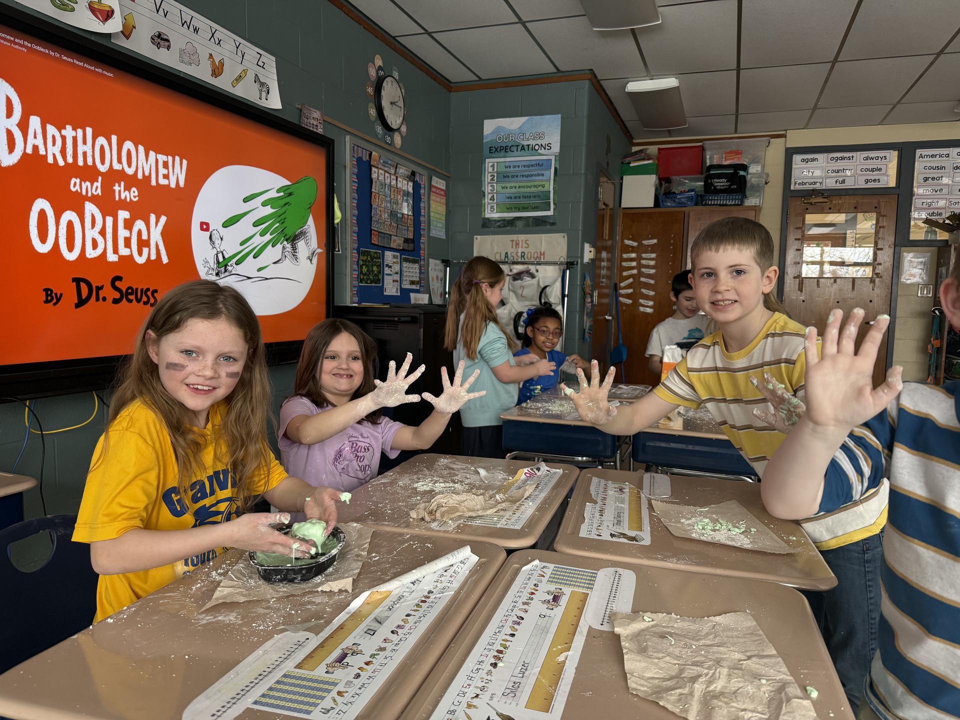 The students had so much fun exploring this interesting substance and observing how it behaves like both a solid and a liquid! We will continue our discussion about Oobleck in science next week as we deepen our understanding of matter.